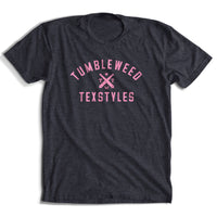 The Tumbleweed TexStyles Cannon logo in navy with a touch of pink. So you can Pink Out for Texas. We have partnered with the National Breast Cancer Foundation based in Frisco, TX to raise funds to support women in need. 20% of the net proceeds will be donated to the NBCF organization. This is a unisex/mens fit t-shirt.
